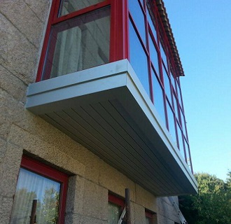 Alféizar de aluminio anodizado natural con falso techo de chapa acanalada, con acabado en color rojo.