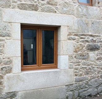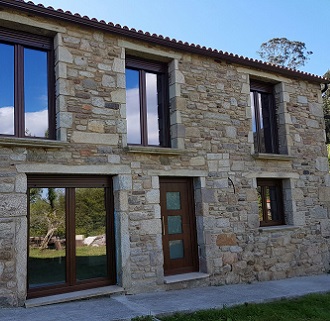 Preciosa casa de piedra con ventanas de PVC Nogal y Vidrio Guardian Sun.