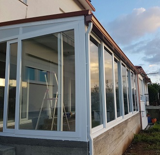 Cierre en porche de PVC con vidrios PLANISTAR, formado por dos vidrios para un mejor aislamiento térmico.